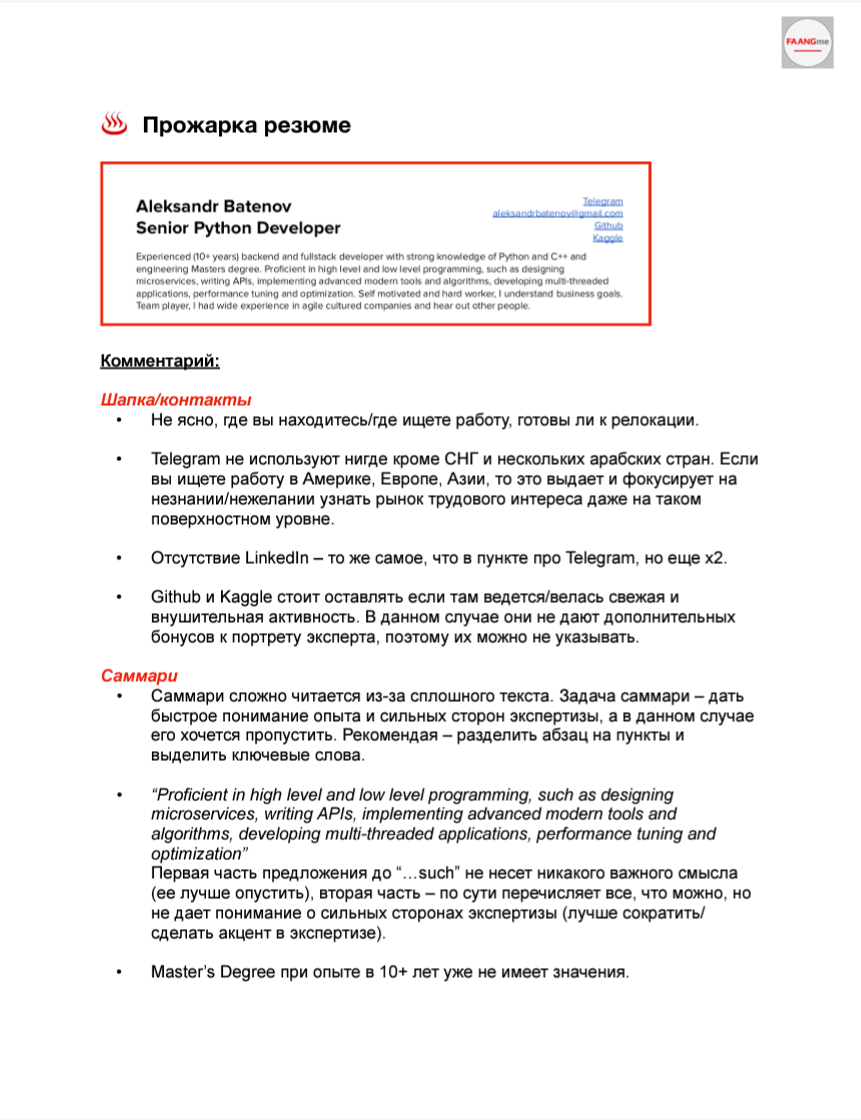 Бонус: шаблон резюме по стандартам FAANG, гайд по резюме, примеры резюме код разные уровни, гайд по LinkedIn, разбор ошибок в LinkedIn на примере разных профилей